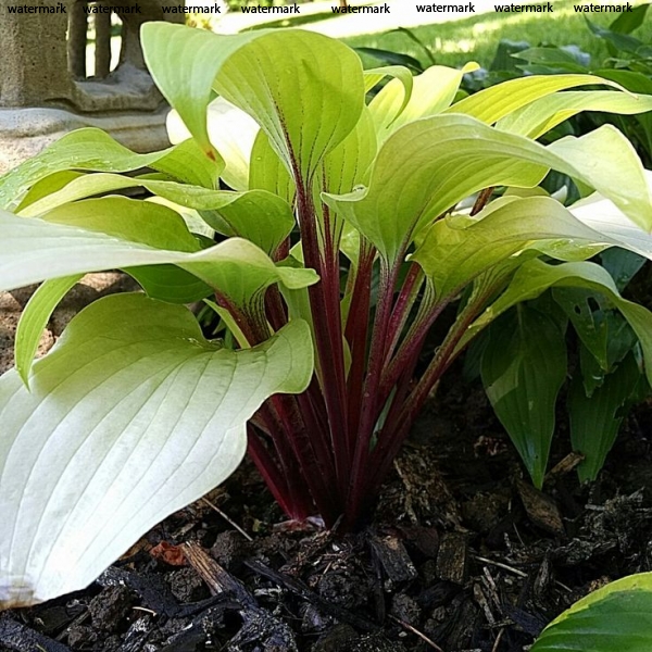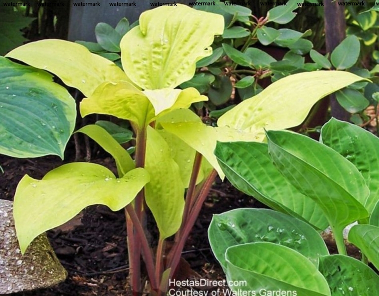 Листья сохраняют ярко-желтую окраску до августа, в конце лета становятся зеленовато-желтыми. Характерной особенностью сорта являются красновато-пурпурные черешки листа и окрашенные цветоносы. Нарядный и интересный сорт.