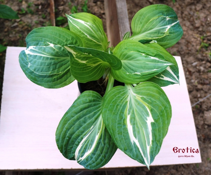 Сине-зеленые толстые листья с более светлой сине-зеленой серединой, окруженной толстой белой линией. Серединка листа еще светлеет в течение сезона.