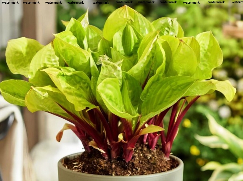 Элегантное сочетание ярко-жёлтых листьев и тёмно-красных черешков. Тёмно-красная окраска черешка доходит до середины центральной жилки листа.