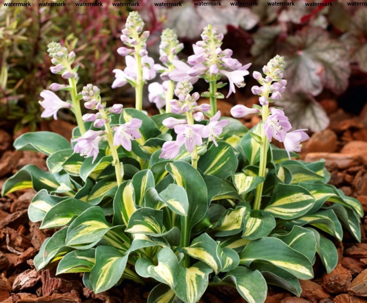Плотные овальные листья с широкой кремовой полосой в центре, с двухцветной зелено-голубой каймой. Крупные сиренево-розовые цветы украшают сорт густым букетом.