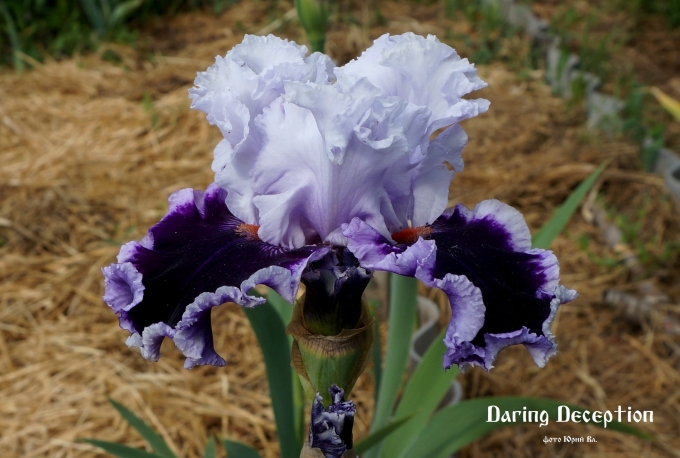 Пушистые белые стандарты со светло-фиолетовыйм напылением, фолы бархатно-фиолетовые, с роскошной широкой белой сильно гофрированной пенной каймой , белые брызги по обеим сторонам мандариновой бородки, легкий аромат.