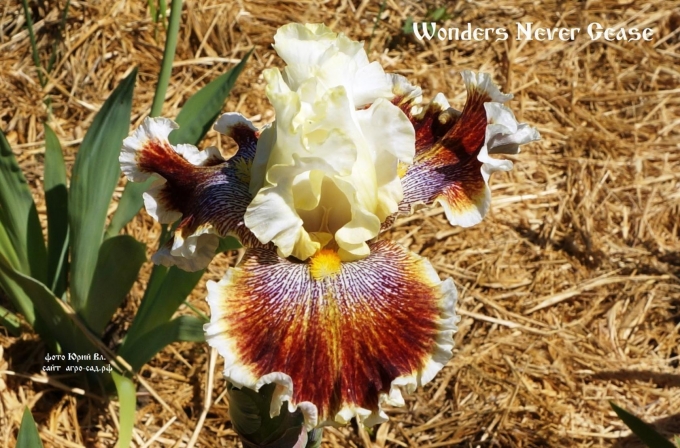 Белые, с золотом стандарты, фолы – причудливая сетка узора от сливового до рубиново-каштанового с золотистым, переливающимся напылением.