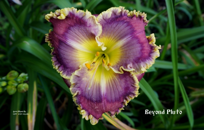 Пульсирующий пурпурный цветок, с огромным лавандово-пурпурным с серебром водяным знаком . Великолепная гофрированная тройная кайма - лавандовая, пурпурная с золотой ЗУБАСТОЙ каймой.
