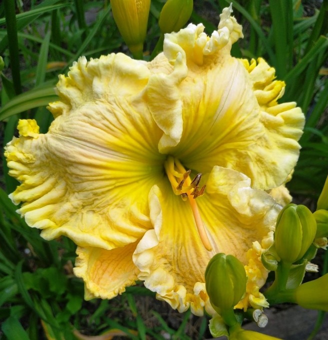 Огромный, роскошный цветок ( 20 см !) нежно-желтый с ярким зеленым горлом. Необычно широкие, перекрывающиеся, плотной фактуры лепестки. Красивая гофрировка по краям лепестков.