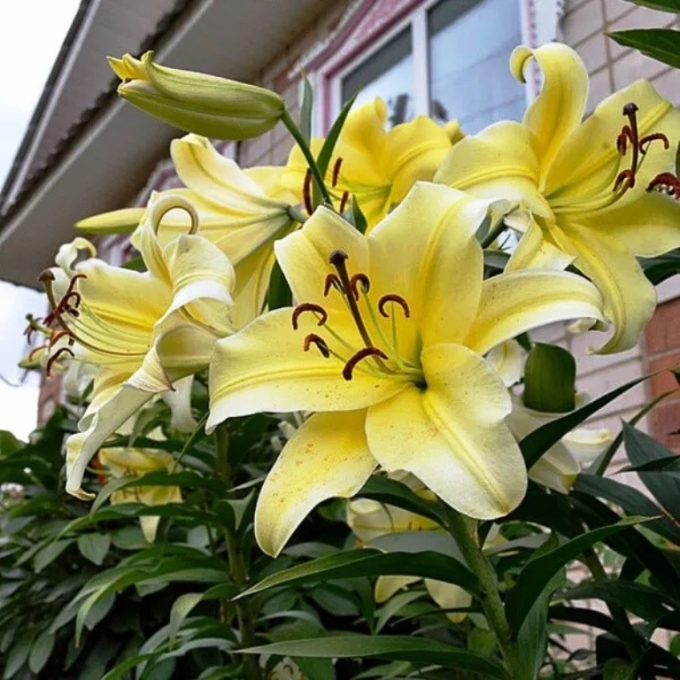 ОТ - гибрид, ОЧЕНЬ КРУПНЫЙ ванильно-жёлтый с чёрными тычинками, 30+ см, H-120см.