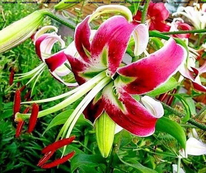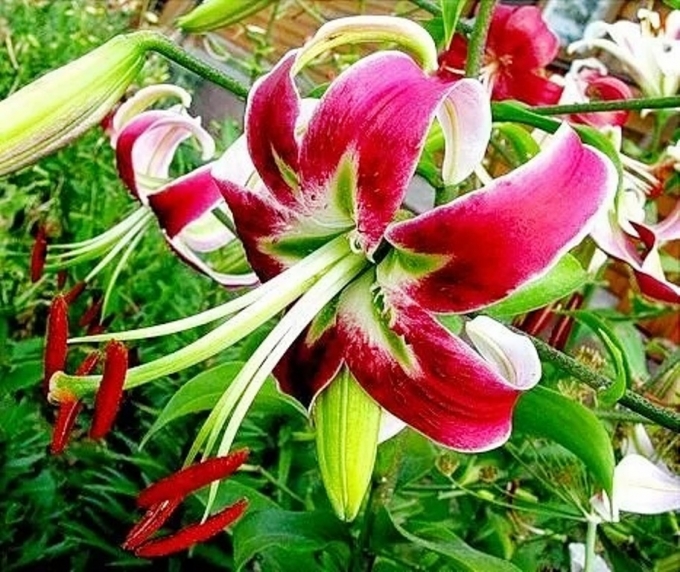 Многоцветковая лилия, цветки пурпурно-красного цвета с темн-красными точками , чалмовидные.