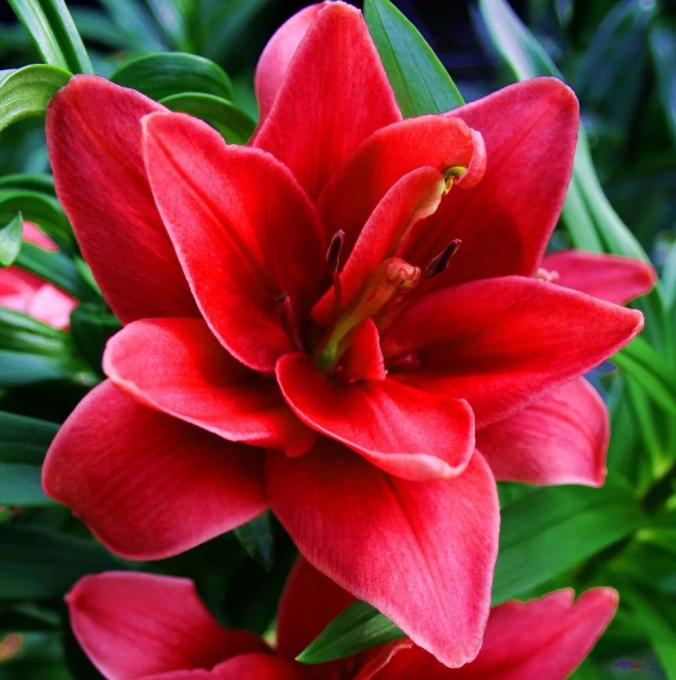 Азиатский гибрид, цветок малиново-красный, глянцевый, махровый, H-80 см.