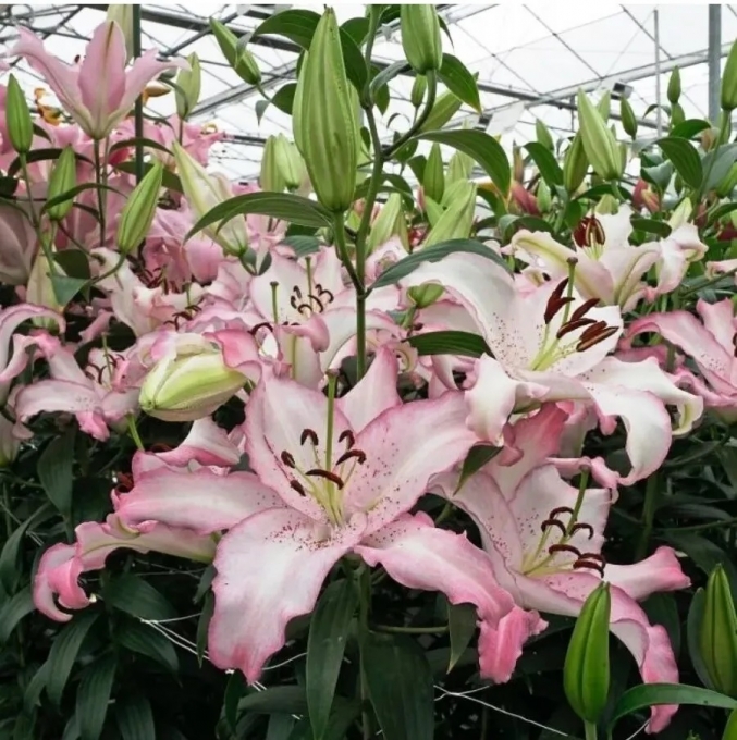 OR гибрид, белый, узкое фиолетовое обрамление, цветы гофрированные, диаметром 22 см., H-105 см.