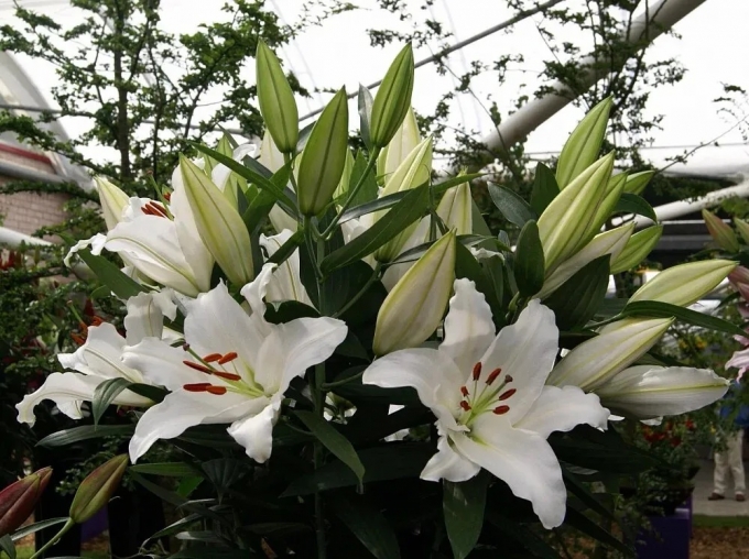 Цветок ОЧЕНЬ КРУПНЫЙ 30 - 35 см белый с оранжевыми тычинками, легкое гофре, H-120 см.