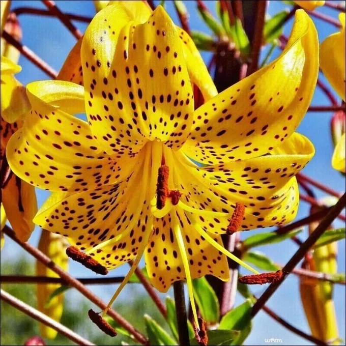 Цветки ярко-желтые с темно-бордовым частым крапом, обращены вниз.