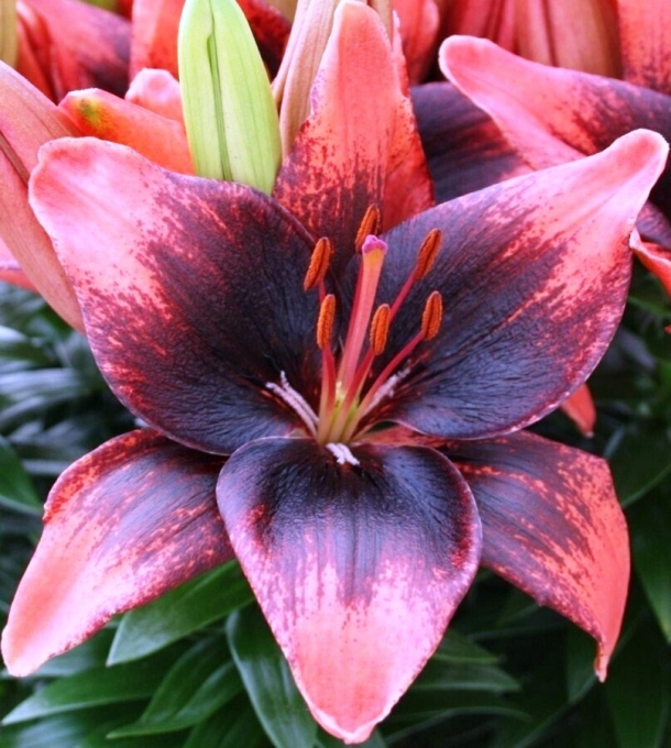 Имеет насыщенно коралловый окрас цветков с черным крапом, усиливающимся к середине цветка.
