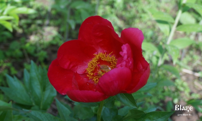 Полумахровый, пион с крупным двух-трехрядным цветком, -16 см - яркой карминно-красной окраски с синеватым отливом у основания лепестков.