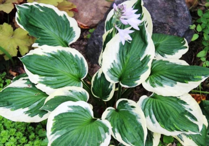Сердцевидные темно-зеленые листья с широкими белыми краями.