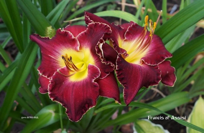 Назван в честь святого Франциска Ассизкого, незабываемой окраски: ярко вишневый (темно-красный бургундский) крупный цветок (15 см).
