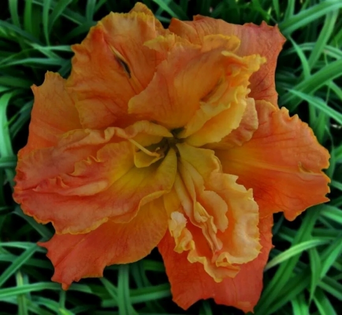 Крупный мандариново-розовый с зелёным горлом гофрированный махровый цветок.