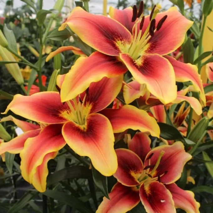 AOA сорт бронзово-алый с желтой каймой и желтым центром, выглядит как пламя, H-100 см.