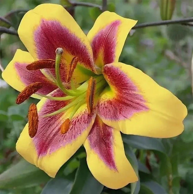 ОТ- гибрид, кремово-жёлтый, рубиновый от центра до 2/3 лепестка, H-200 см.