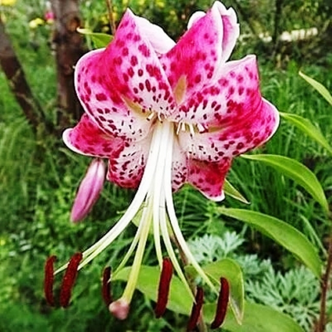 Многоцветковая лилия, Специозум, цветки пунцово-красного цвета с темно-красными точками, белой каймой, чалмовидные.